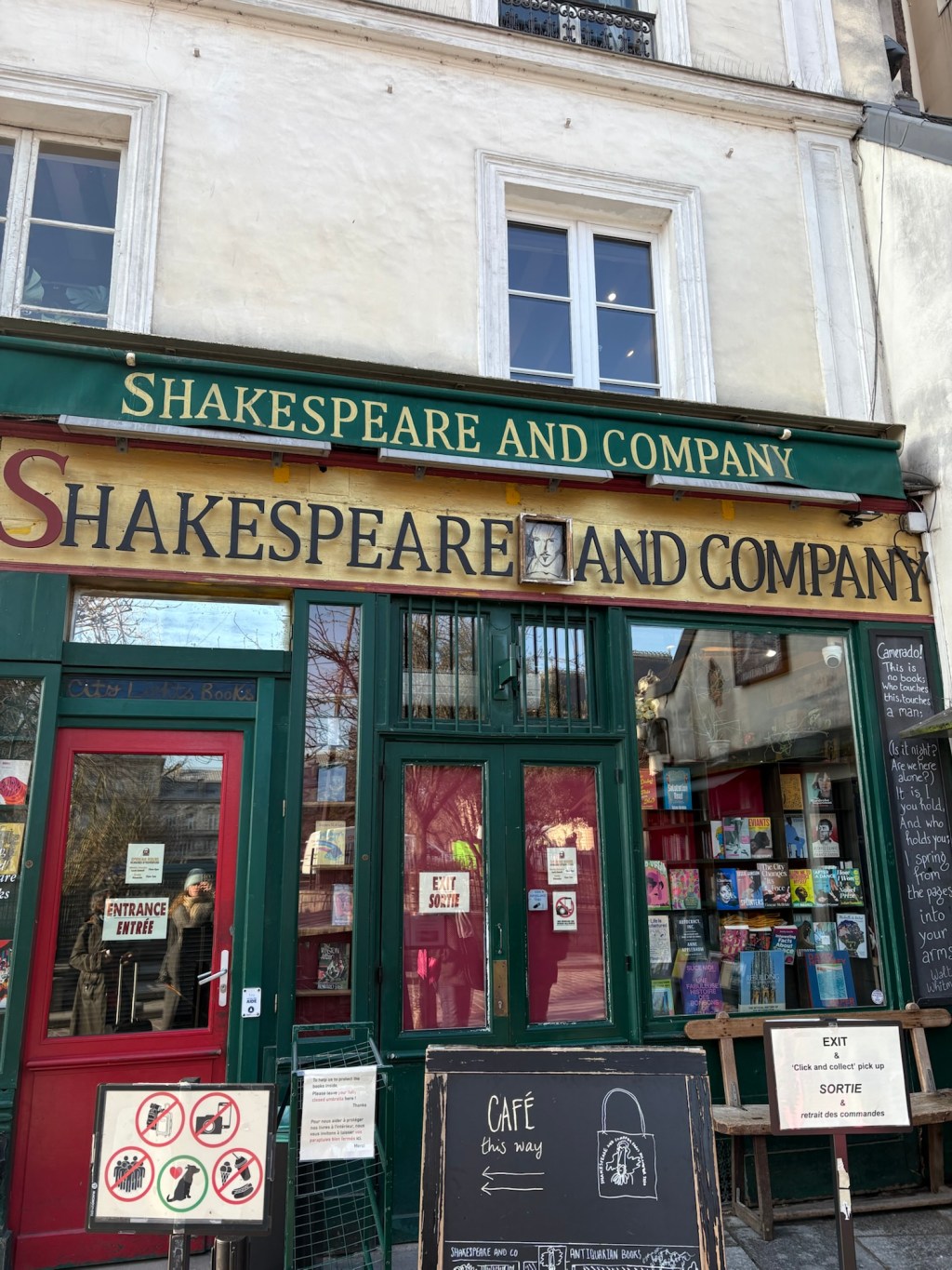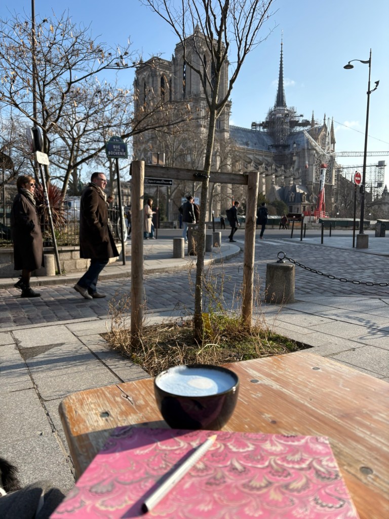 It is nearly 10 o’clock in the morning, and I am sipping a Blue Latte (whatever that may be) outside Shakespeare and Co Cafe, in the cold morning sunshine on a Friday. The bookshop is not yet open. I can see Notre-Dame, and I am watching the shadows play hide and seek in each of her changing crevices. There is a queue for the bookshop already, so I am not sure I’ll go in. There are worse views for breakfast. I feel very settled, very heels-dug-in. A part of me feels like this could be my life. I don’t know if it’s only fleeting; I can’t tell.