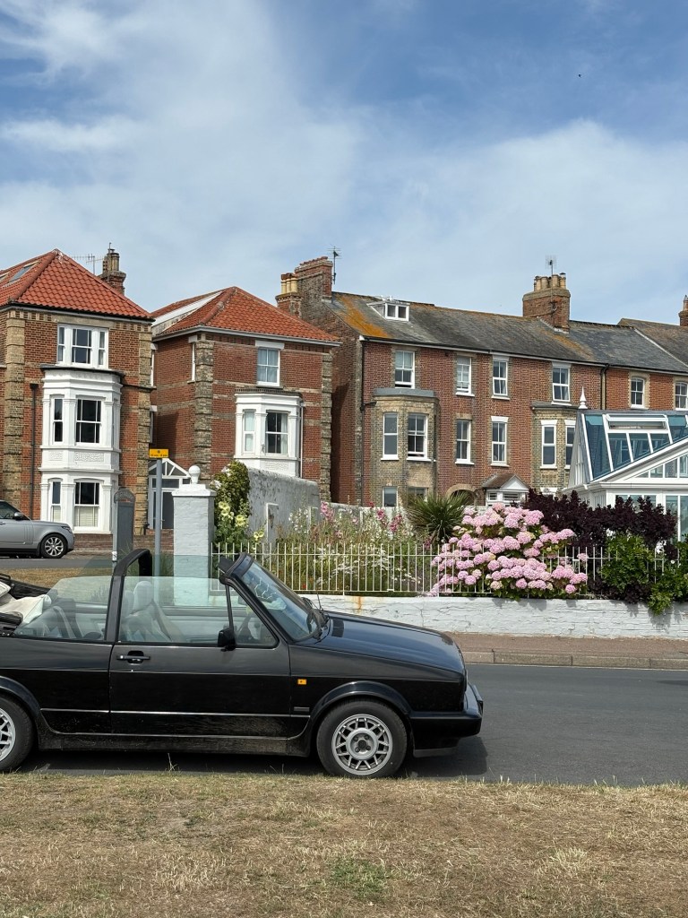 They sit in a beach hut called ‘Companionable’, not talking to each other. The tall lady’s Hungarian Vizsla is called Elvis. The jet skis disturb the peace, but I still think they’re cool. There is a kite floating with bunting coming off it in strings. It looks like a jellyfish who has swallowed a rainbow. Jonah and the Whale. Jellyfish and the Kite. A man skims a stone into the waves. One-two-three jumps. Men block the footpath with their dogs and say to no one in particular “We’re just sorting out the world — it won’t take us long”. I believe them. Their world is Sun-drenched and Labradors. There are bunnies on the lawn — too many — a problem. I like her yellow dress and think she looks like Belle. A man with an earring flashes me a nervous smile before opening his packet of fish and chips – hot. I smell the steam. Salty, sour. Unfortunately, his hair is scraped back in a bun. It negates the appeal of the hoop in his lobe.