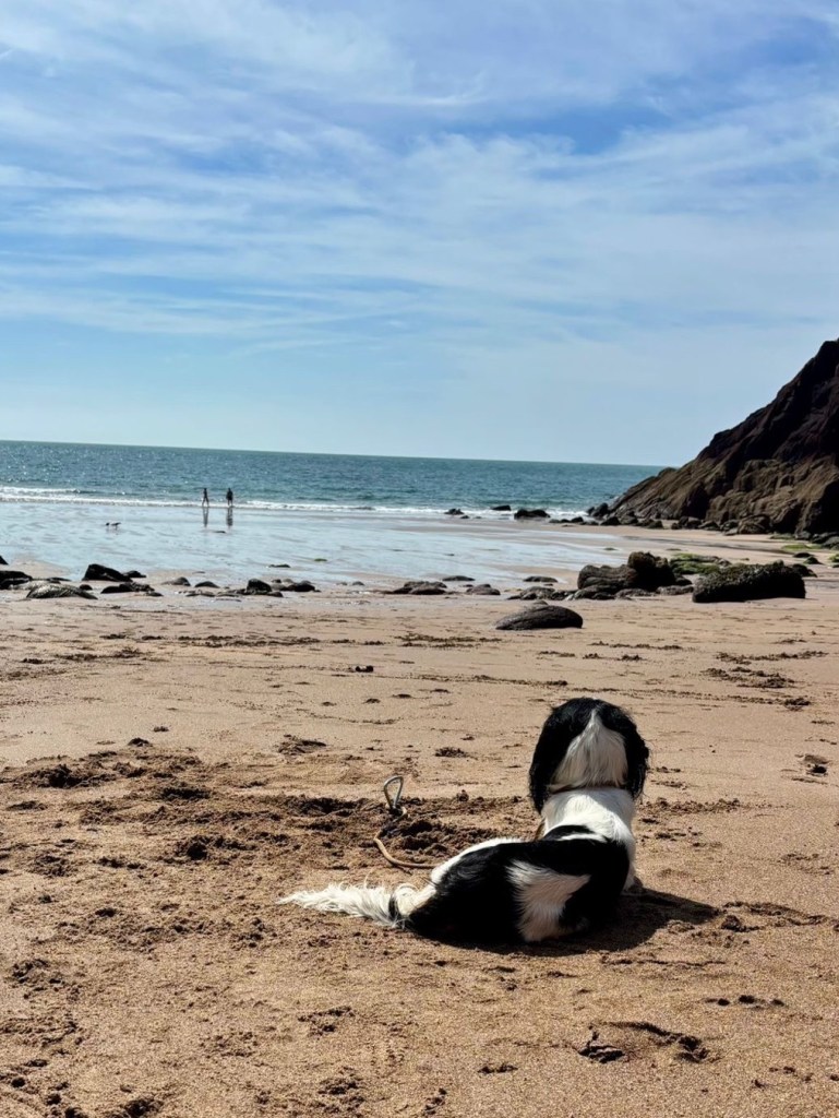 My skin is warm in the last of the summer sun. Everyone around me seems in love – arms up over the other’s shoulders, hands entwined and head resting on the other’s lap. I am not in love. The sea sparkles: there are crystals in my rock (which is hard, and grates my bikini-bare bottom like Parmesan in every reshuffle-to-get-comfortable I try (and fail) to make. We are in Wales; the waves lap and the sky is grey on the horizon). My skin is warmed by the sun and I am not in love. These seem in the light of day to be sure-fire certainties in a world of unknowns, as certain as the hardness of my rock and the grating of my bottom. There are so many facts surrounding my life: my mother has cancer, my grandfathers are dying, my dog is howling and sitting on an abandoned surfboard because another dog on the beach is on heat and he wants to hump her. I do not want him to be a sex-pest; he is being castrated next week (shh, don’t tell him). My skin is warmed by the last of the summer sun, but my bikini bottoms are wet and claggy and cold and I am wearing a woolen jumper over my bikini top so that the dampness seeps into soft sheepskin and smells like a tired ewe on a rainy day. A stray saltwater drip runs like a tear down my back. My family play cricket. My friends play with them. My dog howls. I will release the dog and go and play cricket too.